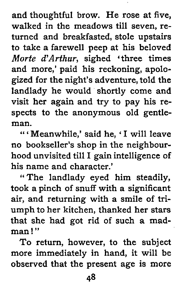 "Such intelligence only sharpened the curiosity and increased the restlessness of poor Ferdinand. He retired to his bibliomaniacal bed, but not to repose. The morning sunbeams, which irradiated the bookcase with complete effect, shone upon his pallid countenance[48] and thoughtful brow. He rose at five, walked in the meadows till seven, returned and breakfasted, stole upstairs to take a farewell peep at his beloved Morte d'Arthur, sighed 'three times and more,' paid his reckoning, apologized for the night's adventure, told the landlady he would shortly come and visit her again and try to pay his respects to the anonymous old gentleman.