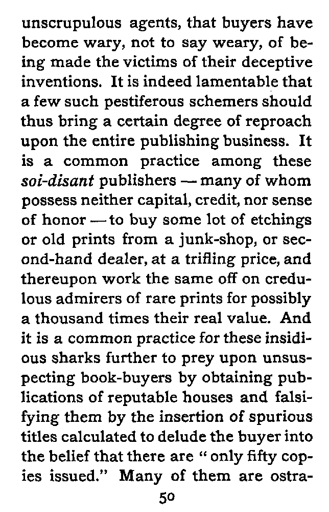 To return, however, to the subject more immediately in hand, it will be observed that the present age is more[49] prolific of bibliophiles than any preceding one, and that the growing interest in collecting fine books is attended by a relatively increasing demand for a higher standard of excellency of manufacture. A few years ago, there were only two or three publishers in this country who "specialized" in fine editions, while at present there are no less than thirty publishing houses, large and small, and as many more "private presses" engaged in the production of beautiful books to appease the demands of book-buyers. Many of these are well established and conducted upon thoroughly honest business principles; some, unfortunately, are not. The publication and sale of books—especially the so-called "de luxe" editions—is, like some other branches of industry, beset with numerous evils; so many sharp practices, indeed, having been resorted to by a few conscienceless publishers, and by a certain class of[50] unscrupulous agents, that buyers have become wary, not to say weary, of being made the victims of their deceptive inventions. It is indeed lamentable that a few such pestiferous schemers should thus bring a certain degree of reproach upon the entire publishing business. It is a common practice among these soi-disant publishers—many of whom possess neither capital, credit, nor sense of honor—to buy some lot of etchings or old prints from a junk-shop, or second-hand dealer, at a trifling price, and thereupon work the same off on credulous admirers of rare prints for possibly a thousand times their real value. And it is a common practice for these insidious sharks further to prey upon unsuspecting book-buyers by obtaining publications of reputable houses and falsifying them by the insertion of spurious titles calculated to delude the buyer into the belief that there are "only fifty copies issued." Many of them are ostracized[51] book-salesmen who have at some previous time enjoyed the confidence of their employers, but have been ex-communicated by all honest publishers and booksellers on account of dishonest proclivities. They are therefore set adrift to prey upon the public, and are a constant menace to both publishers and buyers. I shall pay my further respects to these counterfeiters later on when I come to the subject of Book Clubs; in the mean while, it need hardly be pointed out that reprehensible methods of this kind are uniformly condemned among all respectable publishers and book-dealers, and that buyers should cautiously discriminate against those who practice them. It is not surprising that even the honest publishers and dealers themselves are occasionally made the scapegoats of these obnoxious parasites; but the astute collector is rarely "caught" by their schemes; and after a book-buyer has[52] passed the primary or "experience" stages of book-collecting, he (or she) is designated as a "dead one," in the common parlance of the underground trade here referred to. Fortunate, indeed, are the bibliophiles who have passed unscathed into the category of "dead ones."