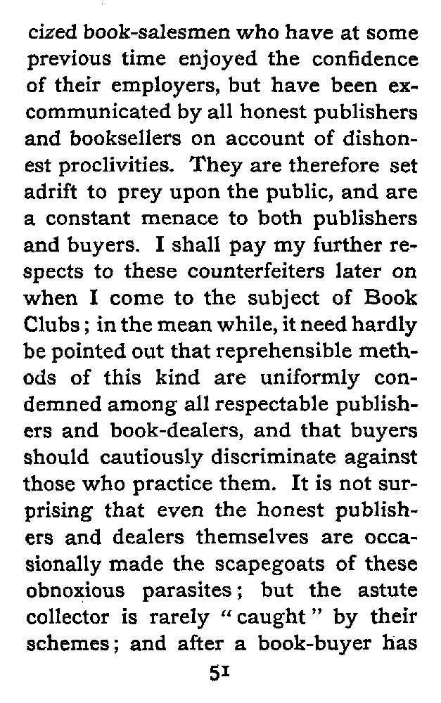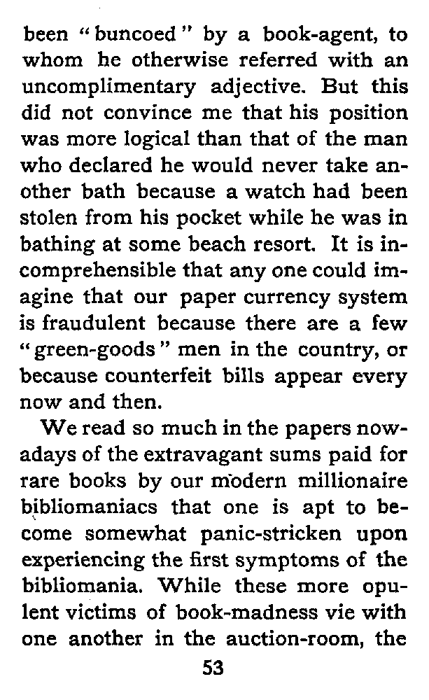 That my present condemnatory observations are not directed against that great majority of publishers, booksellers, and agents whose methods in business are founded upon sincerity and integrity, will, I take it, be clearly understood; and I am, indeed, forced partially to disagree with Mr. Joline in his vigorous and general proscription of "subscription book-agents," for experience shows that there are many worthy people of this class, however much they may suffer by the sins of some of their kind. An acquaintance once said to me that he would "never buy another book," because he had[53] been "buncoed" by a book-agent, to whom he otherwise referred with an uncomplimentary adjective. But this did not convince me that his position was more logical than that of the man who declared he would never take another bath because a watch had been stolen from his pocket while he was in bathing at some beach resort. It is incomprehensible that any one could imagine that our paper currency system is fraudulent because there are a few "green-goods" men in the country, or because counterfeit bills appear every now and then.