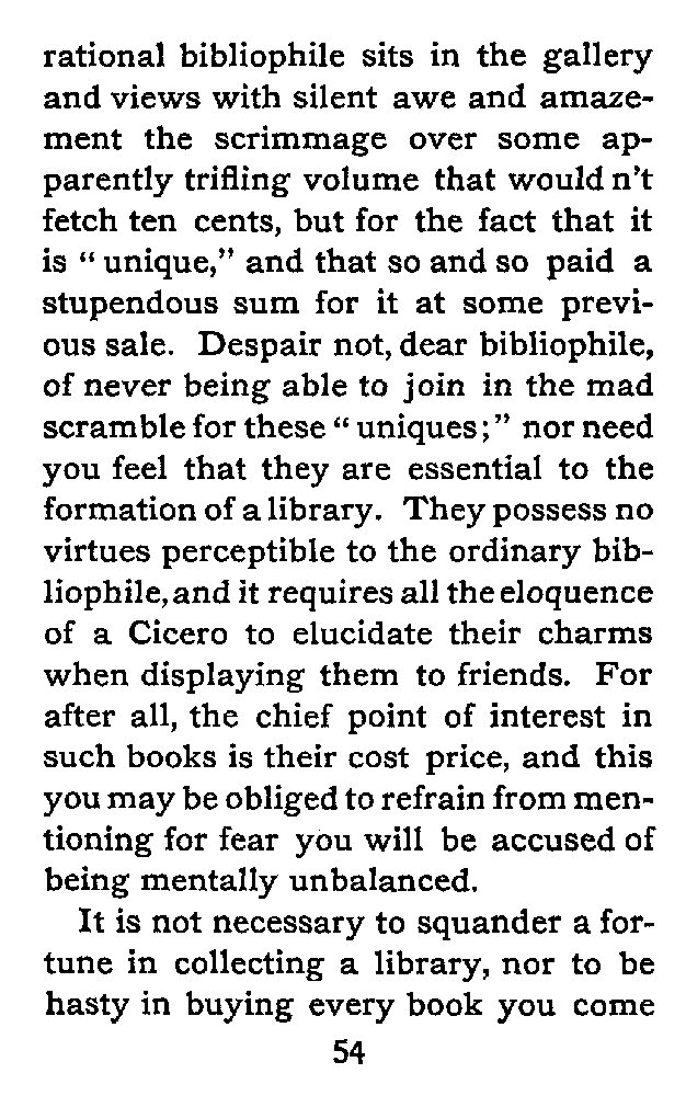 We read so much in the papers nowadays of the extravagant sums paid for rare books by our modern millionaire bibliomaniacs that one is apt to become somewhat panic-stricken upon experiencing the first symptoms of the bibliomania. While these more opulent victims of book-madness vie with one another in the auction-room, the[54] rational bibliophile sits in the gallery and views with silent awe and amazement the scrimmage over some apparently trifling volume that wouldn't fetch ten cents, but for the fact that it is "unique," and that so and so paid a stupendous sum for it at some previous sale. Despair not, dear bibliophile, of never being able to join in the mad scramble for these "uniques;" nor need you feel that they are essential to the formation of a library. They possess no virtues perceptible to the ordinary bibliophile, and it requires all the eloquence of a Cicero to elucidate their charms when displaying them to friends. For after all, the chief point of interest in such books is their cost price, and this you may be obliged to refrain from mentioning for fear you will be accused of being mentally unbalanced.