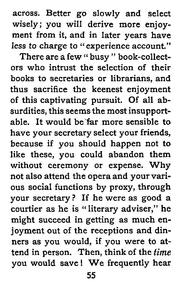 There are a few "busy" book-collectors who intrust the selection of their books to secretaries or librarians, and thus sacrifice the keenest enjoyment of this captivating pursuit. Of all absurdities, this seems the most insupportable. It would be far more sensible to have your secretary select your friends, because if you should happen not to like these, you could abandon them without ceremony or expense. Why not also attend the opera and your various social functions by proxy, through your secretary? If he were as good a courtier as he is "literary adviser," he might succeed in getting as much enjoyment out of the receptions and dinners as you would, if you were to attend in person. Then, think of the time you would save! We frequently hear[56] the remark: "I have no time to devote to my library. I am very fond of books, but haven't time to collect or read them." And yet seeing what may be done in this regard by care and system, and that the greatest readers have been the busiest men, it seems strange that persons of intelligence should thus express themselves; should admit such obvious fatuity of view and procedure.