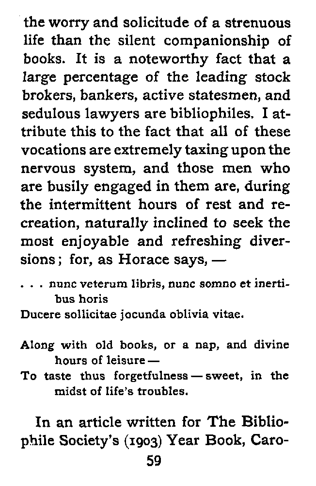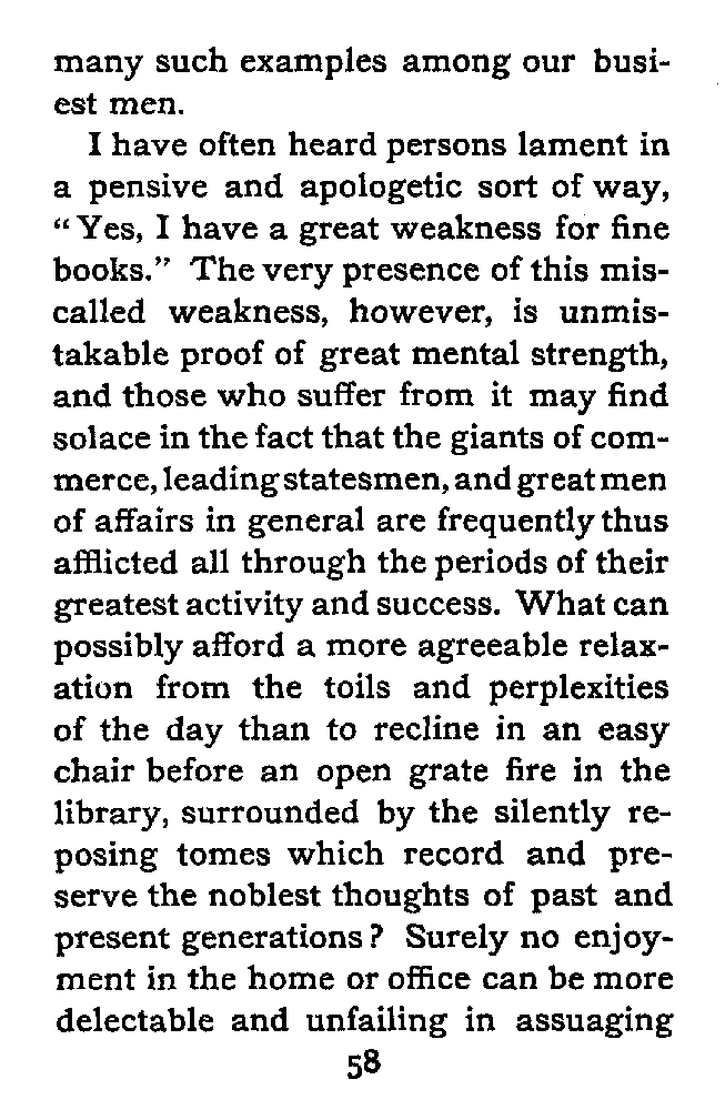I have often heard persons lament in a pensive and apologetic sort of way, "Yes, I have a great weakness for fine books." The very presence of this mis-called weakness, however, is unmistakable proof of great mental strength, and those who suffer from it may find solace in the fact that the giants of commerce, leading statesmen, and great men of affairs in general are frequently thus afflicted all through the periods of their greatest activity and success. What can possibly afford a more agreeable relaxation from the toils and perplexities of the day than to recline in an easy chair before an open grate fire in the library, surrounded by the silently reposing tomes which record and preserve the noblest thoughts of past and present generations? Surely no enjoyment in the home or office can be more delectable and unfailing in assuaging[59] the worry and solicitude of a strenuous life than the silent companionship of books. It is a noteworthy fact that a large percentage of the leading stock brokers, bankers, active statesmen, and sedulous lawyers are bibliophiles. I attribute this to the fact that all of these vocations are extremely taxing upon the nervous system, and those men who are busily engaged in them are, during the intermittent hours of rest and recreation, naturally inclined to seek the most enjoyable and refreshing diversions; for, as Horace says,—