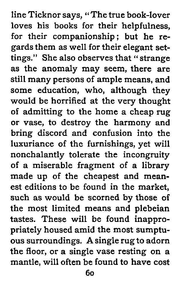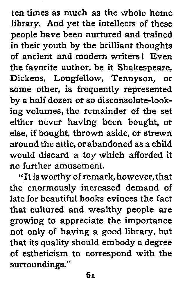 In an article written for The Bibliophile Society's (1903) Year Book, Caroline[60] Ticknor says, "The true book-lover loves his books for their helpfulness, for their companionship; but he regards them as well for their elegant settings." She also observes that "strange as the anomaly may seem, there are still many persons of ample means, and some education, who, although they would be horrified at the very thought of admitting to the home a cheap rug or vase, to destroy the harmony and bring discord and confusion into the luxuriance of the furnishings, yet will nonchalantly tolerate the incongruity of a miserable fragment of a library made up of the cheapest and meanest editions to be found in the market, such as would be scorned by those of the most limited means and plebeian tastes. These will be found inappropriately housed amid the most sumptuous surroundings. A single rug to adorn the floor, or a single vase resting on a mantle, will often be found to have cost[61] ten times as much as the whole home library. And yet the intellects of these people have been nurtured and trained in their youth by the brilliant thoughts of ancient and modern writers! Even the favorite author, be it Shakespeare, Dickens, Longfellow, Tennyson, or some other, is frequently represented by a half dozen or so disconsolate-looking volumes, the remainder of the set either never having been bought, or else, if bought, thrown aside, or strewn around the attic, or abandoned as a child would discard a toy which afforded it no further amusement.