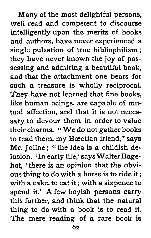Many of the most delightful persons, well read and competent to discourse intelligently upon the merits of books and authors, have never experienced a single pulsation of true bibliophilism; they have never known the joy of possessing and admiring a beautiful book, and that the attachment one bears for such a treasure is wholly reciprocal. They have not learned that fine books, like human beings, are capable of mutual affection, and that it is not necessary to devour them in order to value their charms. "We do not gather books to read them, my Bœotian friend," says Mr. Joline; "the idea is a childish delusion. 'In early life,' says Walter Bagehot, 'there is an opinion that the obvious thing to do with a horse is to ride it; with a cake, to eat it; with a sixpence to spend it.' A few boyish persons carry this further, and think that the natural thing to do with a book is to read it. The mere reading of a rare book is[63] a puerility, an idiosyncrasy of adolescence; it is the ownership of the book which is the matter of distinction. The collector of coins does not accumulate his treasures for the purpose of ultimately spending them in the marketplace. The lover of postage-stamps, small as his horizon may be, does not hoard his colored bits of paper with the intent to employ them in the mailing of letters. When some one complained to Bedford that a book which he had bound did not shut properly, he exclaimed, 'Why, bless me, sir, you've been reading it!'"