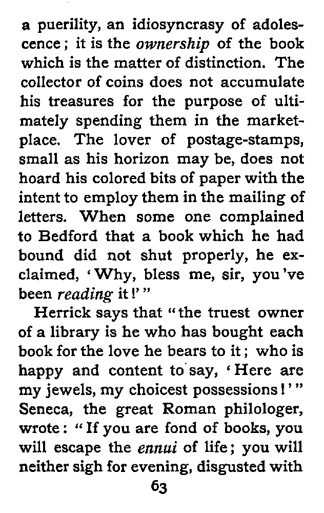 Herrick says that "the truest owner of a library is he who has bought each book for the love he bears to it; who is happy and content to say, 'Here are my jewels, my choicest possessions!'" Seneca, the great Roman philologer, wrote: "If you are fond of books, you will escape the ennui of life; you will neither sigh for evening, disgusted with[64] the occupations of the day, nor will you live dissatisfied with yourself or unprofitable with others." "I am quite transported and comforted in the midst of my books," says the younger Pliny, who was an ardent book-fancier; "they give a zest to the happiest and assuage the anguish of the bitterest moments of existence. Therefore, whether distracted by the cares or losses of my family or my friends, I fly to my library as the only refuge in distress: here I learn to bear adversity with fortitude."