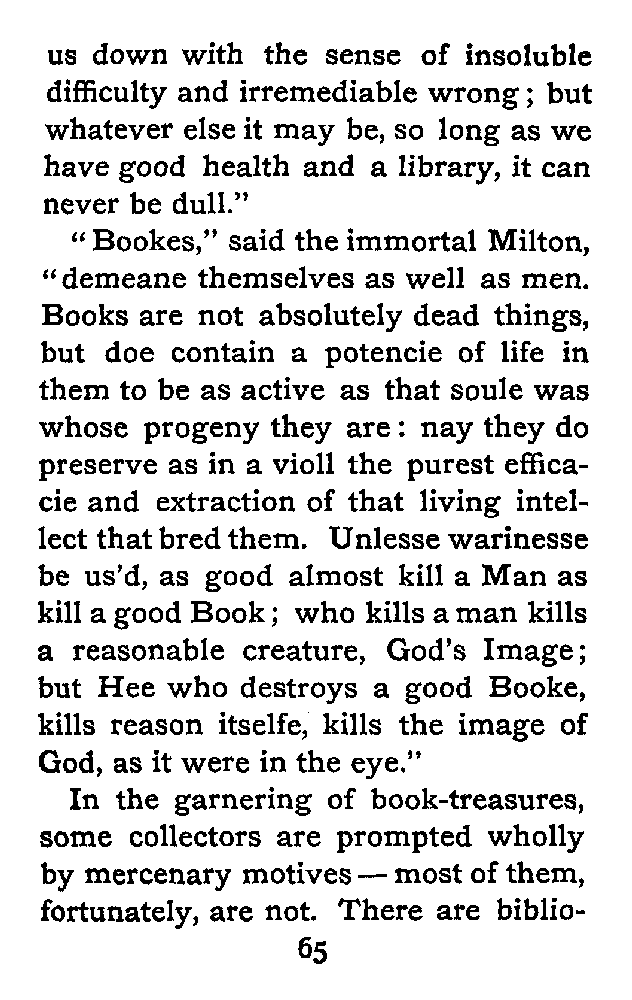 "Bookes," said the immortal Milton, "demeane themselves as well as men. Books are not absolutely dead things, but doe contain a potencie of life in them to be as active as that soule was whose progeny they are: nay they do preserve as in a violl the purest efficacie and extraction of that living intellect that bred them. Unlesse warinesse be us'd, as good almost kill a Man as kill a good Book; who kills a man kills a reasonable creature, God's Image; but Hee who destroys a good Booke, kills reason itselfe, kills the image of God, as it were in the eye."