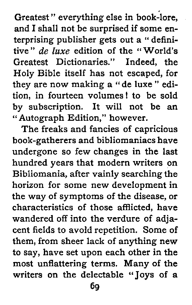 So much has been written about the vagaries of book-collectors and bibliomaniacs that the subject has long since become threadbare, and about the only unexplored field of labor left to the choice of him who would gain a hearing with the reader—if one can be found who is not already weary of reading what the wags think of his (or her) own peculiar whims—is to fall in with the spirit of the age and compile an "International Library of the World's Greatest Gibberish about Bibliomaniacs." We have the "World's[69] Greatest" everything else in book-lore, and I shall not be surprised if some enterprising publisher gets out a "definitive" de luxe edition of the "World's Greatest Dictionaries." Indeed, the Holy Bible itself has not escaped, for they are now making a "de luxe" edition, in fourteen volumes! to be sold by subscription. It will not be an "Autograph Edition," however.
