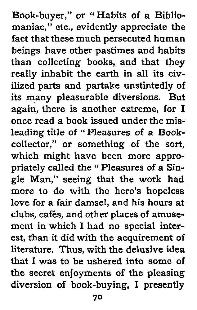 The freaks and fancies of capricious book-gatherers and bibliomaniacs have undergone so few changes in the last hundred years that modern writers on Bibliomania, after vainly searching the horizon for some new development in the way of symptoms of the disease, or characteristics of those afflicted, have wandered off into the verdure of adjacent fields to avoid repetition. Some of them, from sheer lack of anything new to say, have set upon each other in the most unflattering terms. Many of the writers on the delectable "Joys of a[70] Book-buyer," or "Habits of a Bibliomaniac," etc., evidently appreciate the fact that these much persecuted human beings have other pastimes and habits than collecting books, and that they really inhabit the earth in all its civilized parts and partake unstintedly of its many pleasurable diversions. But again, there is another extreme, for I once read a book issued under the misleading title of "Pleasures of a Book-collector," or something of the sort, which might have been more appropriately called the "Pleasures of a Single Man," seeing that the work had more to do with the hero's hopeless love for a fair damsel, and his hours at clubs, cafés, and other places of amusement in which I had no special interest, than it did with the acquirement of literature. Thus, with the delusive idea that I was to be ushered into some of the secret enjoyments of the pleasing diversion of book-buying, I presently[71] found myself more familiar with the habits, vices, and various unimportant matters of the author's conception—points, in short, having no bearing whatever upon the subject under consideration—than with the pleasures of a book-collector. The book was not badly written, nor wholly uninteresting; but if a man buys a ticket to the opera, he doesn't go prepared to see a cock-fight.