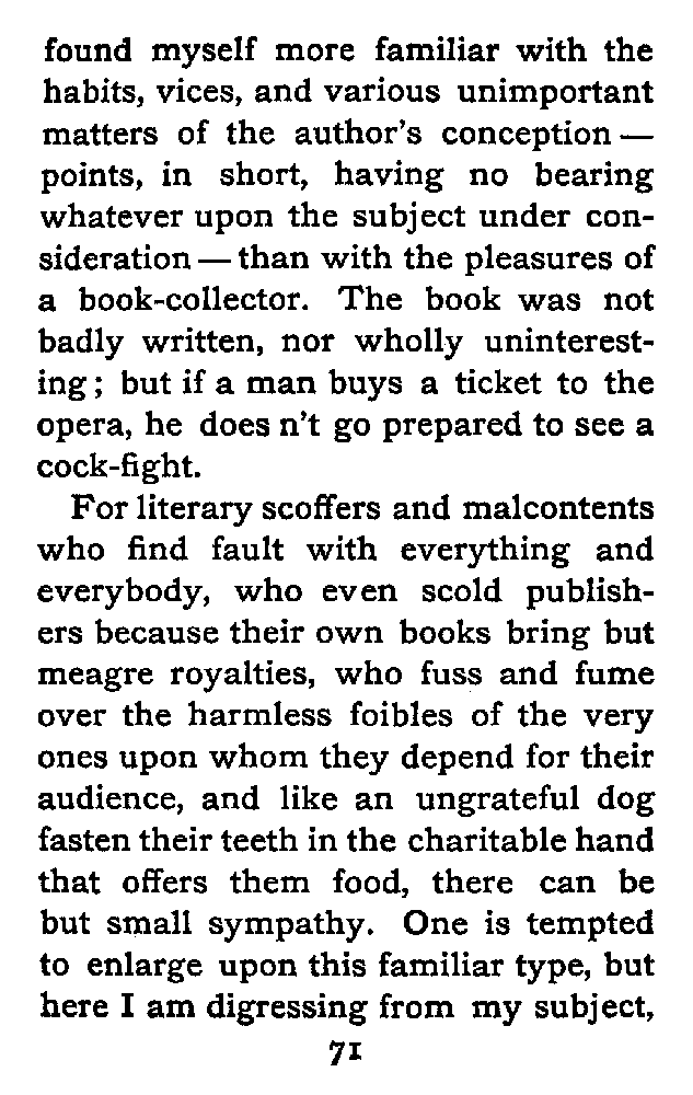 For literary scoffers and malcontents who find fault with everything and everybody, who even scold publishers because their own books bring but meagre royalties, who fuss and fume over the harmless foibles of the very ones upon whom they depend for their audience, and like an ungrateful dog fasten their teeth in the charitable hand that offers them food, there can be but small sympathy. One is tempted to enlarge upon this familiar type, but here I am digressing from my subject,[72] and am committing much the same offence as that of which I have elsewhere accused others.