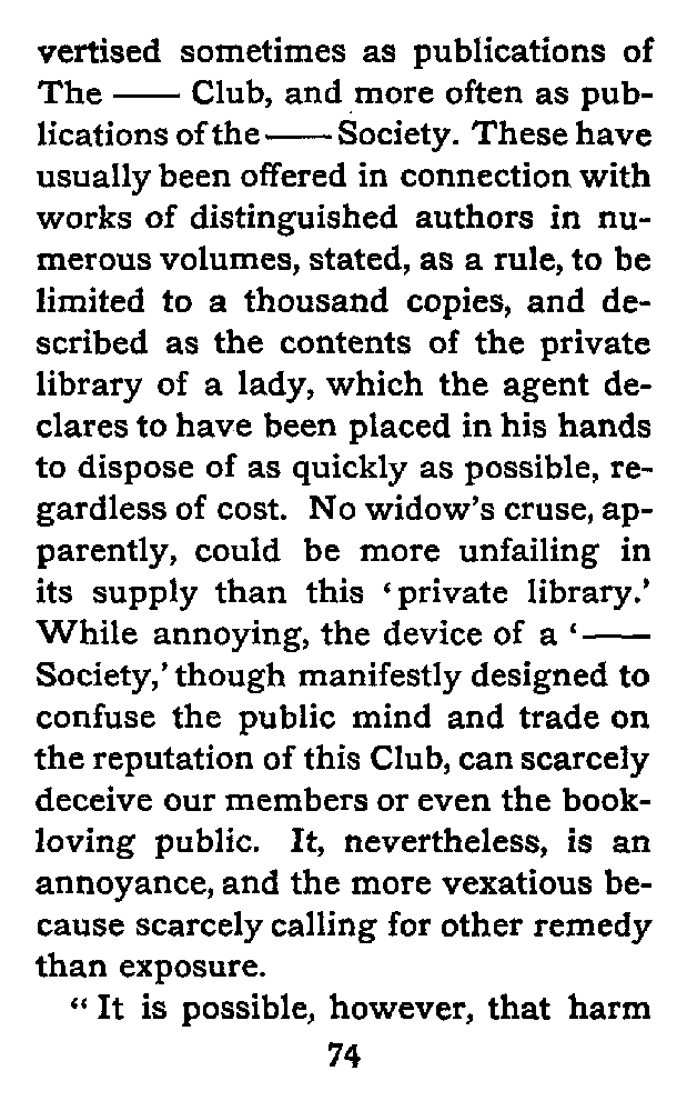 "Fame brings its penalties, and during the last year many of us have suffered considerable annoyance, both individually and as members of the Club, through the exploitation of books advertised[74] sometimes as publications of The —— Club, and more often as publications of the —— Society. These have usually been offered in connection with works of distinguished authors in numerous volumes, stated, as a rule, to be limited to a thousand copies, and described as the contents of the private library of a lady, which the agent declares to have been placed in his hands to dispose of as quickly as possible, regardless of cost. No widow's cruse, apparently, could be more unfailing in its supply than this 'private library.' While annoying, the device of a '—— Society,' though manifestly designed to confuse the public mind and trade on the reputation of this Club, can scarcely deceive our members or even the book-loving public. It, nevertheless, is an annoyance, and the more vexatious because scarcely calling for other remedy than exposure.