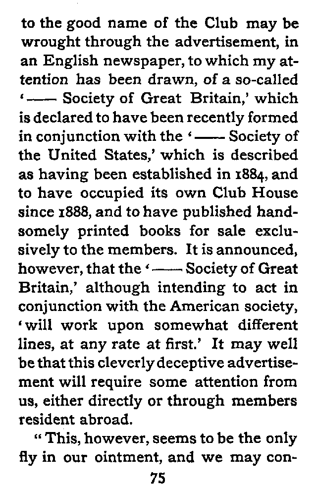 "It is possible, however, that harm[75] to the good name of the Club may be wrought through the advertisement, in an English newspaper, to which my attention has been drawn, of a so-called '—— Society of Great Britain,' which is declared to have been recently formed in conjunction with the '—— Society of the United States,' which is described as having been established in 1884, and to have occupied its own Club House since 1888, and to have published handsomely printed books for sale exclusively to the members. It is announced, however, that the '—— Society of Great Britain,' although intending to act in conjunction with the American society, 'will work upon somewhat different lines, at any rate at first.' It may well be that this cleverly deceptive advertisement will require some attention from us, either directly or through members resident abroad.
