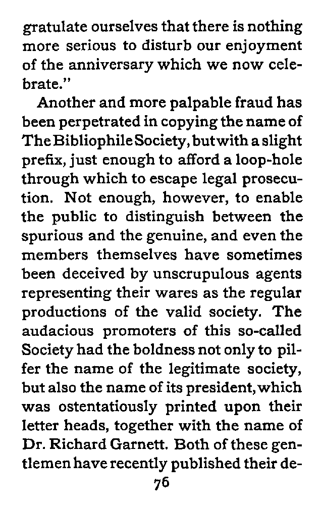 Another and more palpable fraud has been perpetrated in copying the name of The Bibliophile Society, but with a slight prefix, just enough to afford a loop-hole through which to escape legal prosecution. Not enough, however, to enable the public to distinguish between the spurious and the genuine, and even the members themselves have sometimes been deceived by unscrupulous agents representing their wares as the regular productions of the valid society. The audacious promoters of this so-called Society had the boldness not only to pilfer the name of the legitimate society, but also the name of its president, which was ostentatiously printed upon their letter heads, together with the name of Dr. Richard Garnett. Both of these gentlemen have recently published their denunciations[77] through the columns of the press, and protested vigorously against this unauthorized use of their names.