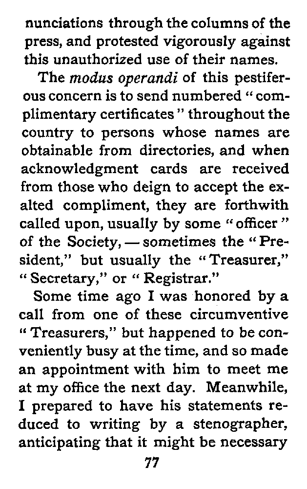 The modus operandi of this pestiferous concern is to send numbered "complimentary certificates" throughout the country to persons whose names are obtainable from directories, and when acknowledgment cards are received from those who deign to accept the exalted compliment, they are forthwith called upon, usually by some "officer" of the Society,—sometimes the "President," but usually the "Treasurer," "Secretary," or "Registrar."