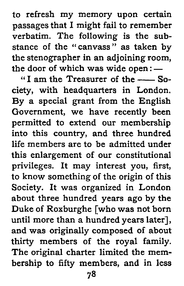 "I am the Treasurer of the —— Society, with headquarters in London. By a special grant from the English Government, we have recently been permitted to extend our membership into this country, and three hundred life members are to be admitted under this enlargement of our constitutional privileges. It may interest you, first, to know something of the origin of this Society. It was organized in London about three hundred years ago by the Duke of Roxburghe [who was not born until more than a hundred years later], and was originally composed of about thirty members of the royal family. The original charter limited the membership to fifty members, and in less[79] than a month the limit was reached. Through the powerful influence of the royal family the Society had easy access to all the great repositories of unpublished manuscripts, and the most valuable and interesting of them were selected for publication. These publications became so enormously valuable that it stimulated a desire on the part of others to join the Society, and particularly, some of the nobility of France and Germany. It was decided to increase the membership to three hundred, and to take in a few members from France, Germany, Italy, and Russia. The Society thrived for about a thousand years [this is either a stenographic error, or else he meant to say a hundred]; then there was a period of inactivity, and later on it was revived again, and the membership limit increased to five hundred. Last year we obtained permission to again increase the membership by taking in[80] three hundred prominent people in America. I am over here to arrange for three vice-presidents,—two for the East and one for the West. I have a special commission to ask you to become one of the honorary vice-presidents and to offer you a life membership for less than half the regular fee, viz., $225.00; the usual fee for life membership is $500.00, but you get it for $225.00 on account of acting as our honorary vice-president for this territory. Of course you would have no regular duties to perform. You would sign all the membership certificates in your district, and in case of the death of any member, you would have the privilege of naming his successor.