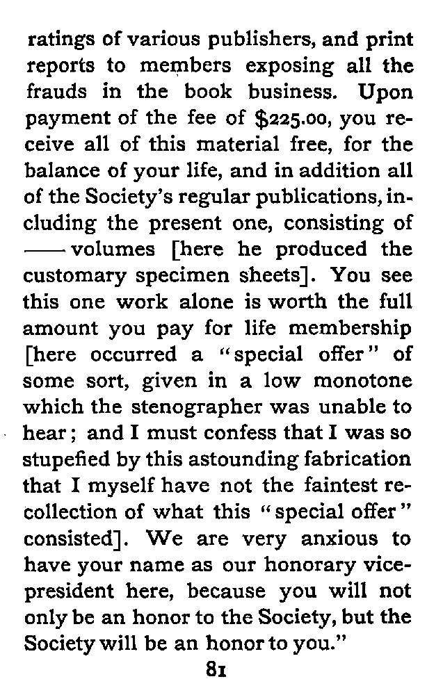 "The Society issues every year a volume giving all the price currents for the year, and keeps the members posted on the advance or decline in the value of all important publications. We also give you in confidence the[81] ratings of various publishers, and print reports to members exposing all the frauds in the book business. Upon payment of the fee of $225.00, you receive all of this material free, for the balance of your life, and in addition all of the Society's regular publications, including the present one, consisting of —— volumes [here he produced the customary specimen sheets]. You see this one work alone is worth the full amount you pay for life membership [here occurred a "special offer" of some sort, given in a low monotone which the stenographer was unable to hear; and I must confess that I was so stupefied by this astounding fabrication that I myself have not the faintest recollection of what this "special offer" consisted]. We are very anxious to have your name as our honorary vice-president here, because you will not only be an honor to the Society, but the Society will be an honor to you."[82]