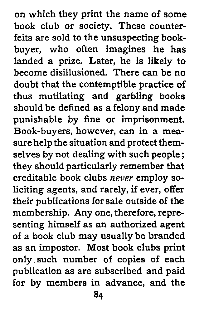 There appears to be no defense for book clubs against these bogus impersonations.[83] The injured club, or society, can sustain no claim for any special damage, because, as not offering its publications in the open market, it actually suffers no ascertainable loss of patronage. The principal damage results to those who are thus victimized in permitting themselves to be deluded into the belief that they are acquiring the valid editions of reputable clubs. When club publications come into the open market they are usually picked up with avidity by collectors, and they have thus grown into very general favor among book-lovers. Indeed, the high esteem in which they have come to be regarded offers a productive field for a few crafty publishers to ply their wily designs in. The audacity of these schemers carries them to such incredible measures that they sometimes buy sheet-stock from reputable publishing houses, change the name of the edition, and deliberately manufacture new titles[84] on which they print the name of some book club or society. These counterfeits are sold to the unsuspecting book-buyer, who often imagines he has landed a prize. Later, he is likely to become disillusioned. There can be no doubt that the contemptible practice of thus mutilating and garbling books should be defined as a felony and made punishable by fine or imprisonment. Book-buyers, however, can in a measure help the situation and protect themselves by not dealing with such people; they should particularly remember that creditable book clubs never employ soliciting agents, and rarely, if ever, offer their publications for sale outside of the membership. Any one, therefore, representing himself as an authorized agent of a book club may usually be branded as an impostor. Most book clubs print only such number of copies of each publication as are subscribed and paid for by members in advance, and the[85] funds thus advanced are used to pay the cost of the edition.