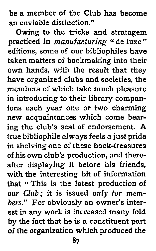 Owing to the tricks and stratagem practiced in manufacturing "de luxe" editions, some of our bibliophiles have taken matters of bookmaking into their own hands, with the result that they have organized clubs and societies, the members of which take much pleasure in introducing to their library companions each year one or two charming new acquaintances which come bearing the club's seal of endorsement. A true bibliophile always feels a just pride in shelving one of these book-treasures of his own club's production, and thereafter displaying it before his friends, with the interesting bit of information that "This is the latest production of our Club; it is issued only for members." For obviously an owner's interest in any work is increased many fold by the fact that he is a constituent part of the organization which produced the[88] same: the relationship to the book in such a case is akin to the love of a parent for a child; and the owner of a fine library will not unusually regard his Club publications and privately printed books as the objects therein which are entitled to his fondest consideration.
