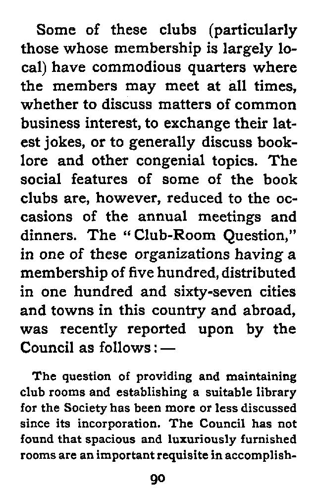 Some of these clubs (particularly those whose membership is largely local) have commodious quarters where the members may meet at all times, whether to discuss matters of common business interest, to exchange their latest jokes, or to generally discuss book-lore and other congenial topics. The social features of some of the book clubs are, however, reduced to the occasions of the annual meetings and dinners. The "Club-Room Question," in one of these organizations having a membership of five hundred, distributed in one hundred and sixty-seven cities and towns in this country and abroad, was recently reported upon by the Council as follows:—