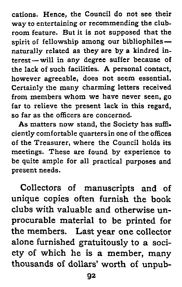 Then, too, while our membership is entirely homogeneous in bibliomaniacal spirit, it is so scattered over such a vast expanse of territory that only a small percentage of the members would be able to enjoy club-room privileges; even those within easy reach of such rooms would probably not frequent them enough to justify any considerable expense in maintenance. It would be necessary, also, to change the present constitution (and to assess the members for annual dues in order to meet current expenses), should the club-room idea be carried out. This would be objectionable on various grounds, and amongst these, because a non-resident member might thus be paying an annual fee without receiving any corresponding benefit in return; a condition in such case which would be tantamount to his meeting an increased charge each year for the privilege of subscribing and paying for the Society's publications.[92] Hence, the Council do not see their way to entertaining or recommending the club-room feature. But it is not supposed that the spirit of fellowship among our bibliophiles—naturally related as they are by a kindred interest—will in any degree suffer because of the lack of such facilities. A personal contact, however agreeable, does not seem essential. Certainly the many charming letters received from members whom we have never seen, go far to relieve the present lack in this regard, so far as the officers are concerned.