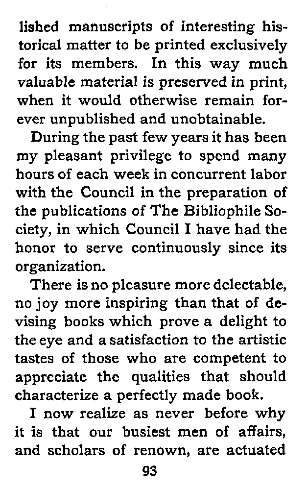During the past few years it has been my pleasant privilege to spend many hours of each week in concurrent labor with the Council in the preparation of the publications of The Bibliophile Society, in which Council I have had the honor to serve continuously since its organization.