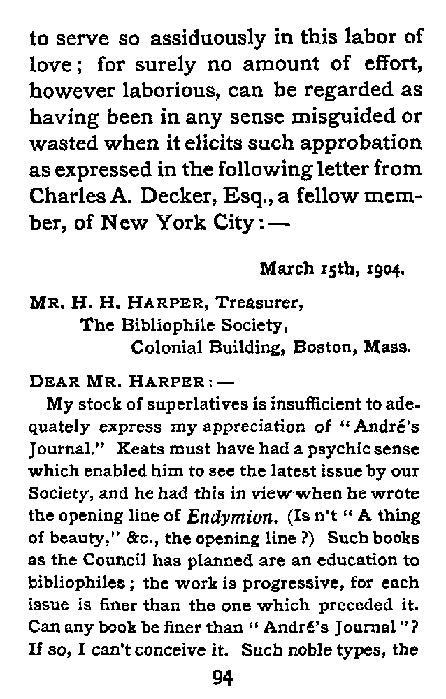 My stock of superlatives is insufficient to adequately express my appreciation of "André's Journal." Keats must have had a psychic sense which enabled him to see the latest issue by our Society, and he had this in view when he wrote the opening line of Endymion. (Is n't "A thing of beauty," &c., the opening line?) Such books as the Council has planned are an education to bibliophiles; the work is progressive, for each issue is finer than the one which preceded it. Can any book be finer than "André's Journal"? If so, I can't conceive it. Such noble types, the[95] pages so perfectly balanced; the margins so broad; the paper of such beautiful texture; the ink so brilliantly black; the maps so marvelously reproduced; the etchings so artistically conceived and executed and the title page so beautifully engraved; then the binding—real vellum—so rich, simple, and in such perfect taste; even the box-cover is fitting in every sense. A perfect book, it seems to me. If there are any shortcomings, and you know them, don't tell me of them, that in my ignorance I may be content.