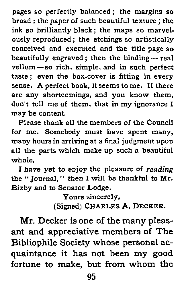 Mr. Decker is one of the many pleasant and appreciative members of The Bibliophile Society whose personal acquaintance it has not been my good fortune to make, but from whom the[96] Society has received many delightful and inspiring letters. The numerous communications thus received from all quarters have been placed before the Council, with the result that the individual interest of every worker has been greatly augmented in the Society's welfare. Indeed, I attribute no small measure of the success and the good name of the Society to the indirect influence of such words of encouragement and expressions of appreciation as have come from the members.