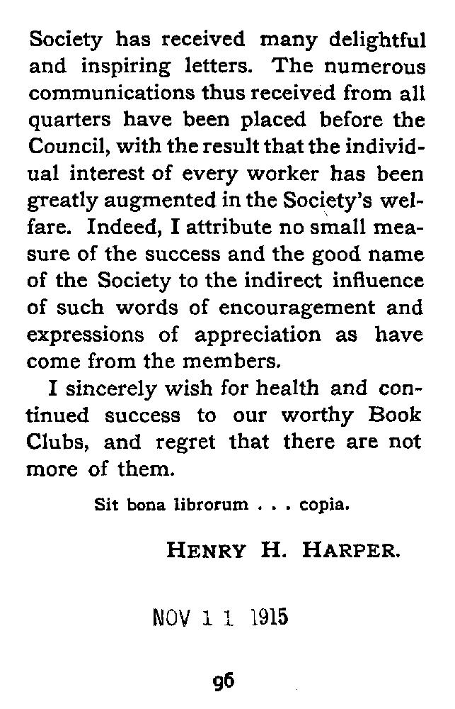 I sincerely wish for health and continued success to our worthy Book Clubs, and regret that there are not more of them.