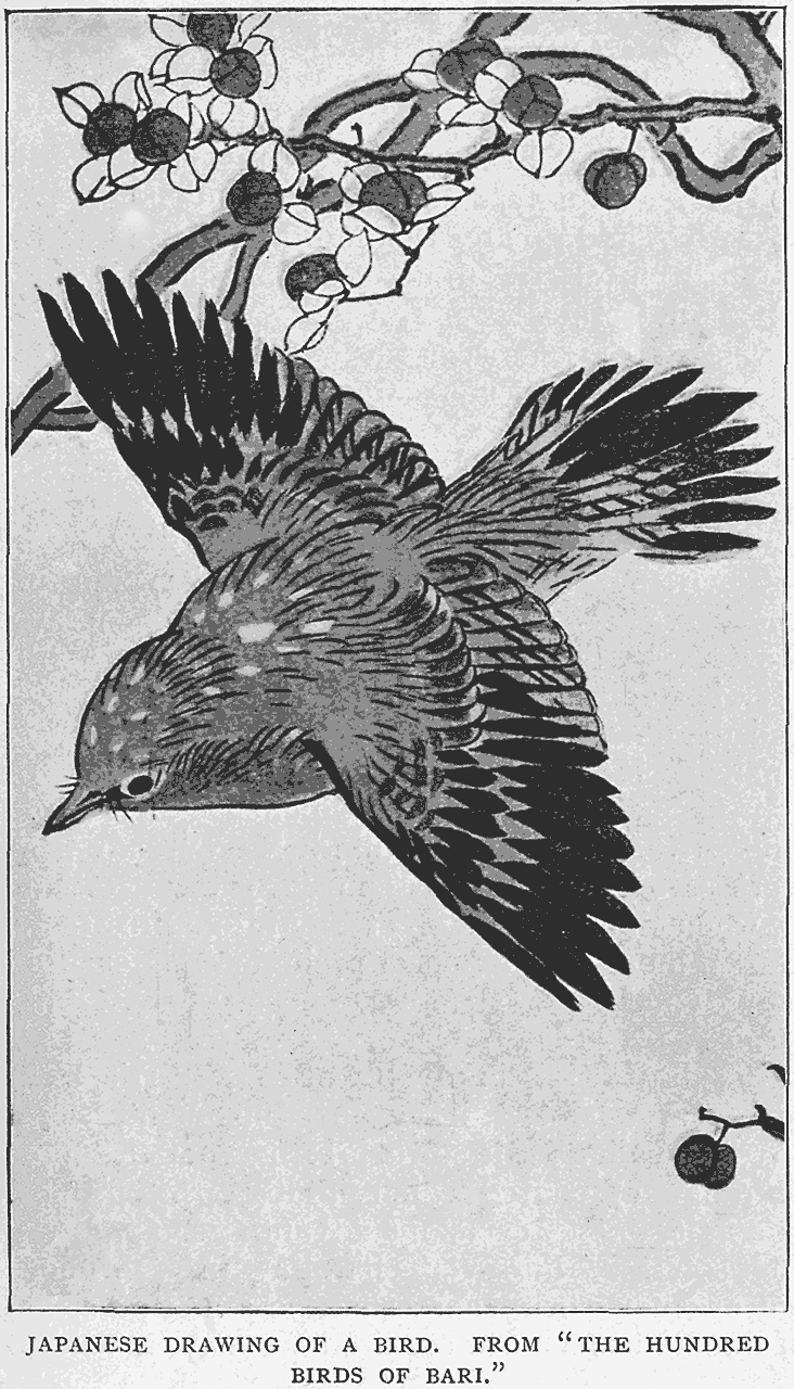The Japanese, also, are instinctive decorators, though in a less formal and more impressionistic way, and with much more naturalistic feeling. Their pictures printed from colour blocks, as well as their "kakimonos," painted on silk, are frankly [267]pattern-pictures, the pattern motive being quite as strong or stronger than the graphic or representative motive.