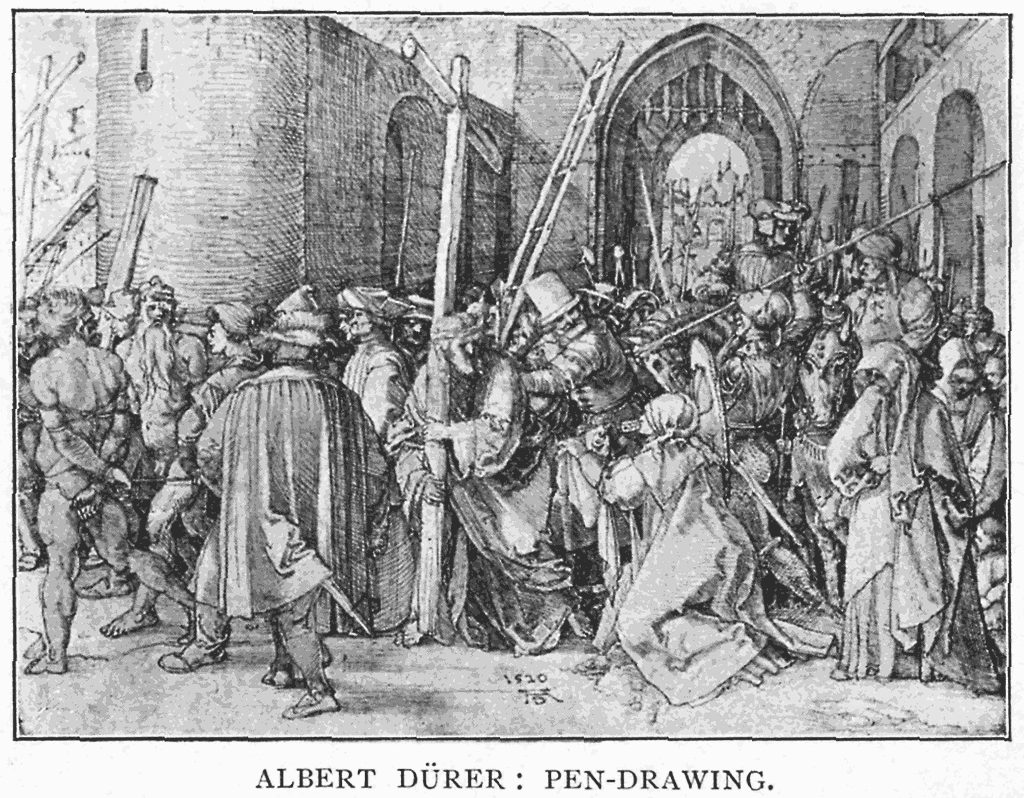 In Paul Veronese we find a cooler key of colour generally, with a fondness for compositions of figures with classical architecture, the rich patterned robes and varied heads contrasting pleasantly with the severe verticals and smooth surfaces of the marble columns—a sumptuous and dignified kind of picture-pattern, and fully adapted to the decoration of Venetian churches and palaces of the Renaissance.