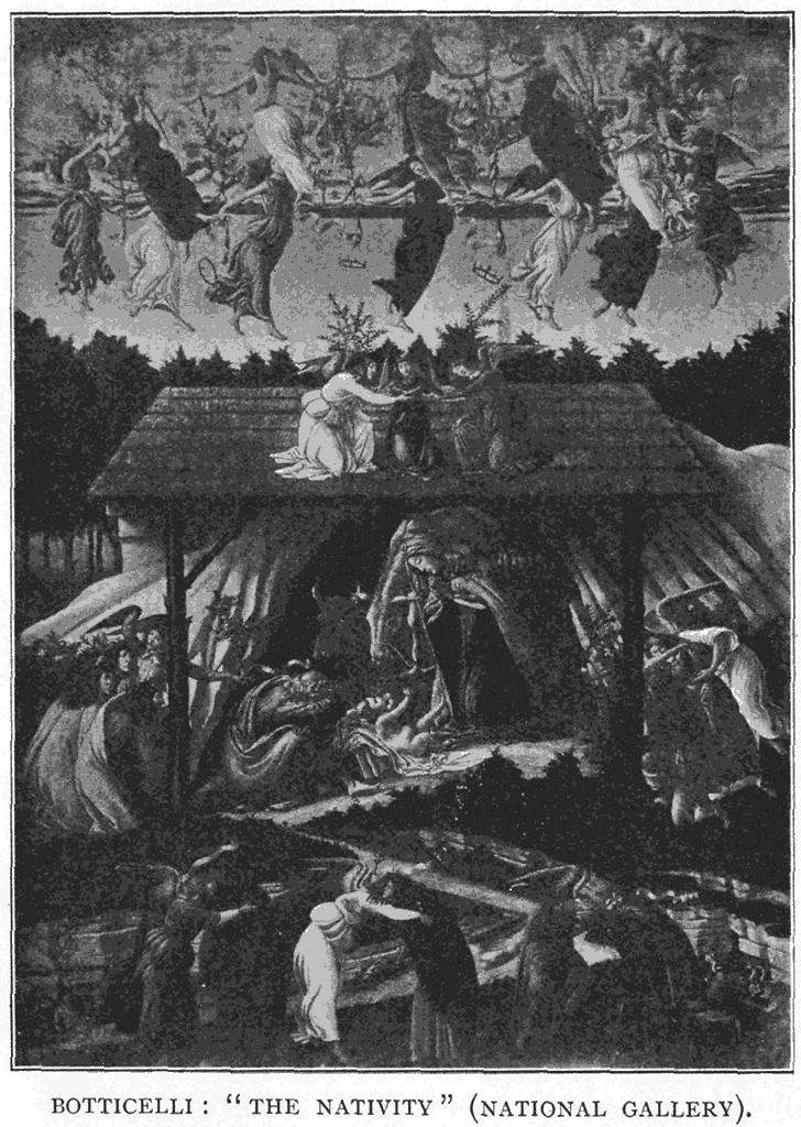 As examples of what might be termed picture-patterns we might recur to the wall paintings, as I have said, of ancient Egypt and early art generally, for their simplest forms; but to take a much later instance, and from the art of Florence in the fifteenth century, look at Botticelli's charming little picture of "The Nativity," in the National Gallery. It has all the intentional, or perhaps instinctive, ornamental aim of Italian art, and its colour scheme shows a most dainty and delicate invention in the strictest relation to the subject and sentiment, and is arranged with the utmost subtlety and the nicest art.