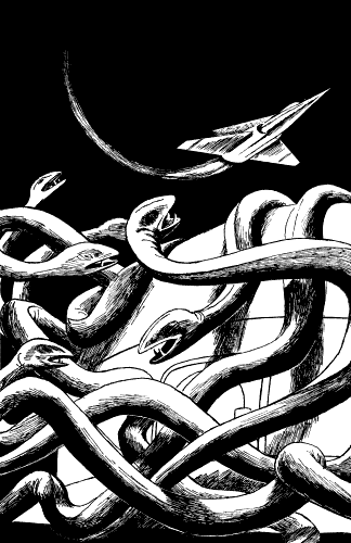 Hideous, thick creatures, lying coiled in masses around the Dome. Preston checked his spacesuit, making sure it was sealed. The instruments told him he was a bare ten miles above Ganymede now. One more swing around the poles would do it.