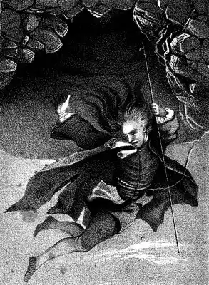 How little did I then dream that like another Phaëton, I should be driven headlong through the air and precipitated to another globe, there to ramble for the space of ten years, before I should see my friends and native land again. The expedition took place in the year 1665. Accompanied by four men to carry the necessary implements, and assist in letting me down, I ascended the mountain. Arrived at the top, near the fatal cave, we sat down to breakfast. Now, for the first time, my heart began to faint, as though it foreboded my coming misfortune; but, in a moment, my half extinguished courage blazed again. I fixed a rope around my body, stood on the edge of the cave, and commended my soul to God. Ordering the men to veer the rope steadily, and to hold when I cried out, I took a boat-hook in my right hand, and glided into the abyss. Aided by the pole, I was enabled to keep clear of the jutting points of rock that would have impeded my progress, as well as have wounded me. I was somewhat anxious about the rope, for it rubbed hard against the[4] rocks at the top; and, in fact, I had scarcely descended twenty to thirty feet, when it gave way, and I tumbled with strange quickness down the abyss, armed like Pluto, with a boat-hook, however, in place of a sceptre.