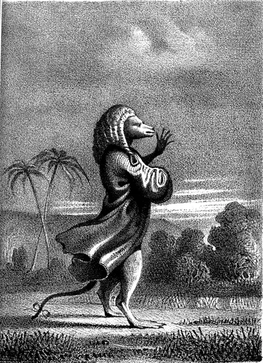 I opened my eyes and saw many trees moving about the field. Imagine my agitation, when one of the trees swept towards me, bent one of its branches, and, lifting me from the ground, carried me off, in spite of my woful cries, followed by an innumerable number of its companions of all kinds and sizes. From their trunks issued certain articulated sounds, which were entirely incomprehensible to me, and of which I retained only the words: Pikel-Emi, on account of their being often repeated. I will here say, these words mean an extraordinary monkey, which creature they took me to be, from my shape and dress. All this, of course, I learned after being some months among them.