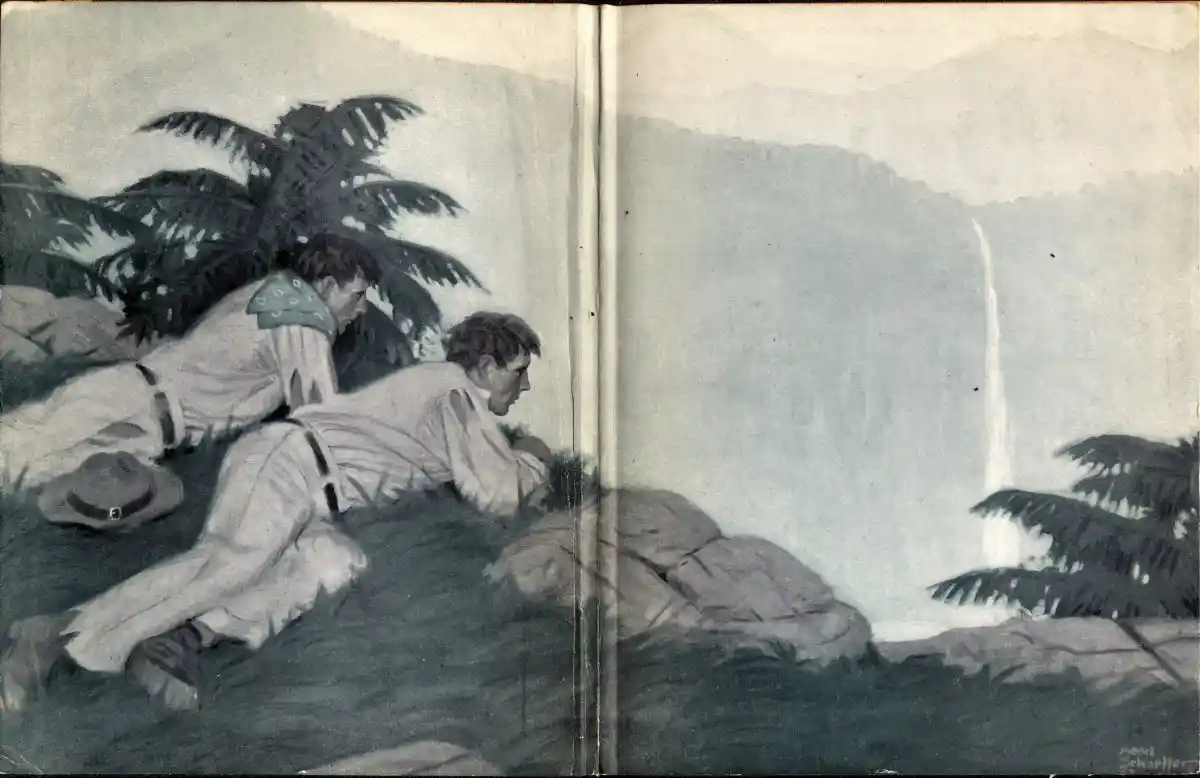 The ascent of the mountain was not very difficult, owing to its being near to the sea, where the island ridges are comparatively low; the path, too, was a fine one, so that in a short time all three were standing on the summit with the two valleys at their feet. The white cascades marking the green head of the Typee valley first caught Toby’s eye; Marheyo’s house could easily be traced by them.