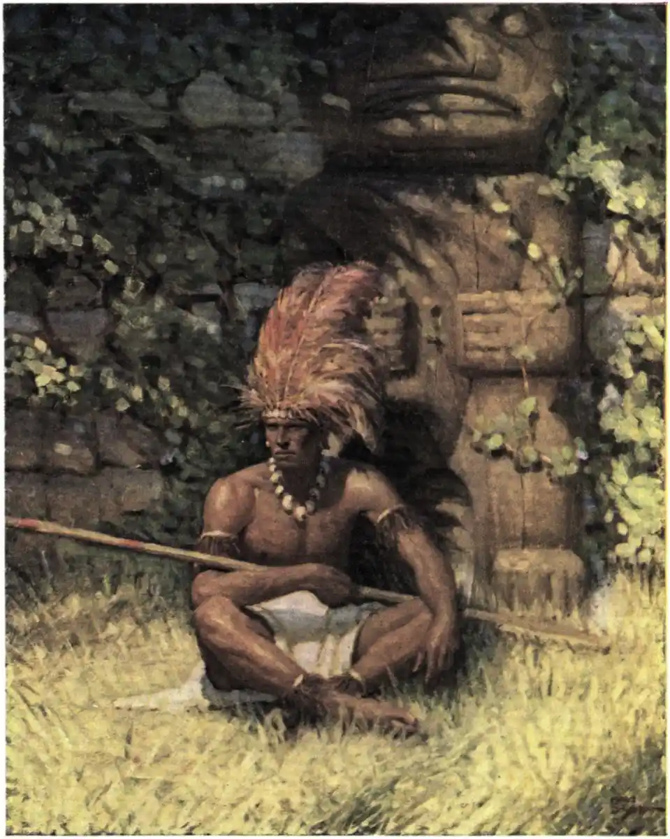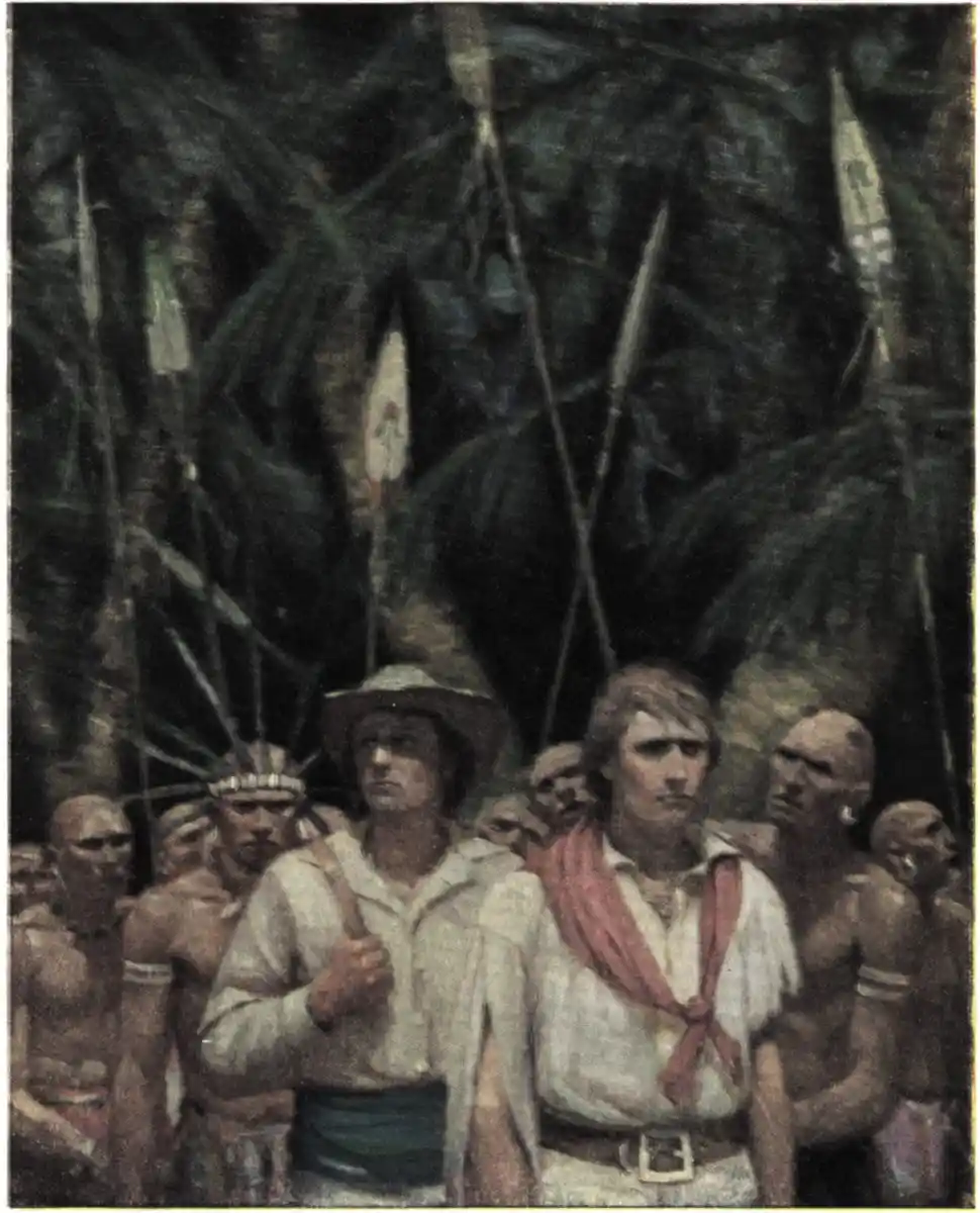 On gaining the heights once more, their way led for a time along several ridges covered with enormous ferns. At last they entered upon a wooded tract, and here they overtook a party of Nukuheva natives, well armed, and carrying bundles of long poles. Jimmy seemed to know them all very well, and stopped for awhile, and had a talk about the “Wee-Wees,” as the people of Nukuheva call the Monsieurs.