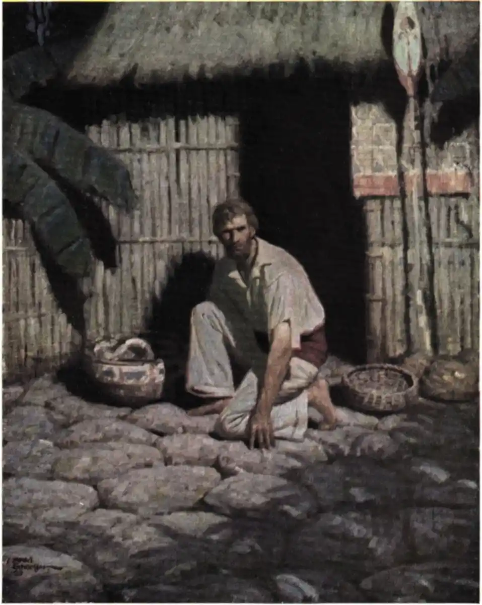 He was still struggling with the islanders, when Jimmy again came up to him, and warned him against irritating them, saying that he was only making matters worse for both of us, and if they became enraged, there was no telling what might happen. At last he made Toby sit down on a broken canoe, by a pile of stones, upon which was a ruinous little shrine, supported by four upright paddles, and in front partly screened by a net. The fishing parties met there, when they came in from the sea, for their offerings were laid before an image, upon a smooth black stone within. This spot, Jimmy said, was strictly “taboo,” and no one would molest or come near him while he stayed by its shadow. The old sailor then went off, and began speaking very earnestly to Mow-Mow and some other chiefs, while all the rest formed a circle round the taboo place, looking intently at Toby, and talking to each other without ceasing.