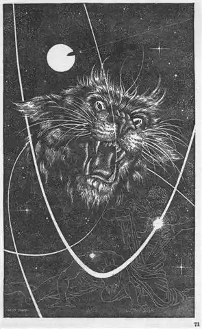 Less than an hour later, the drone of the drivers picked up as the ship, already set on course, began to accelerate in preparation for the jump into hyper-flight. Thompson was in his cabin making a final check of the machine-provided flight data. Buster was in his lap half-asleep. Suddenly the cat jumped from his lap and seemed to pounce on some elusive prey in the room. The cat caught what it was seeking, its jaws crunched, it swallowed.