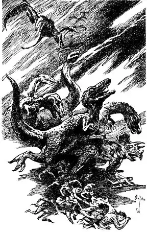 The flames of the burning city danced in the night. The air was heavy with smoke. The screams of the dinosaurs were louder, as if the great beasts were excited by the conflagration in the city of the Ogrum. Craig was vaguely aware that only two guns were firing. In spite of all his efforts to resist the impulse, he sank to his knees. The grenades continued to plunk on the roof. Only one gun was firing. Beside him, Craig saw that Margy Sharp had gone quietly to sleep. She looked like a little girl who is all tired out with play and has decided to lie down and take a nap.