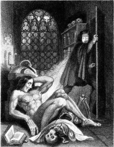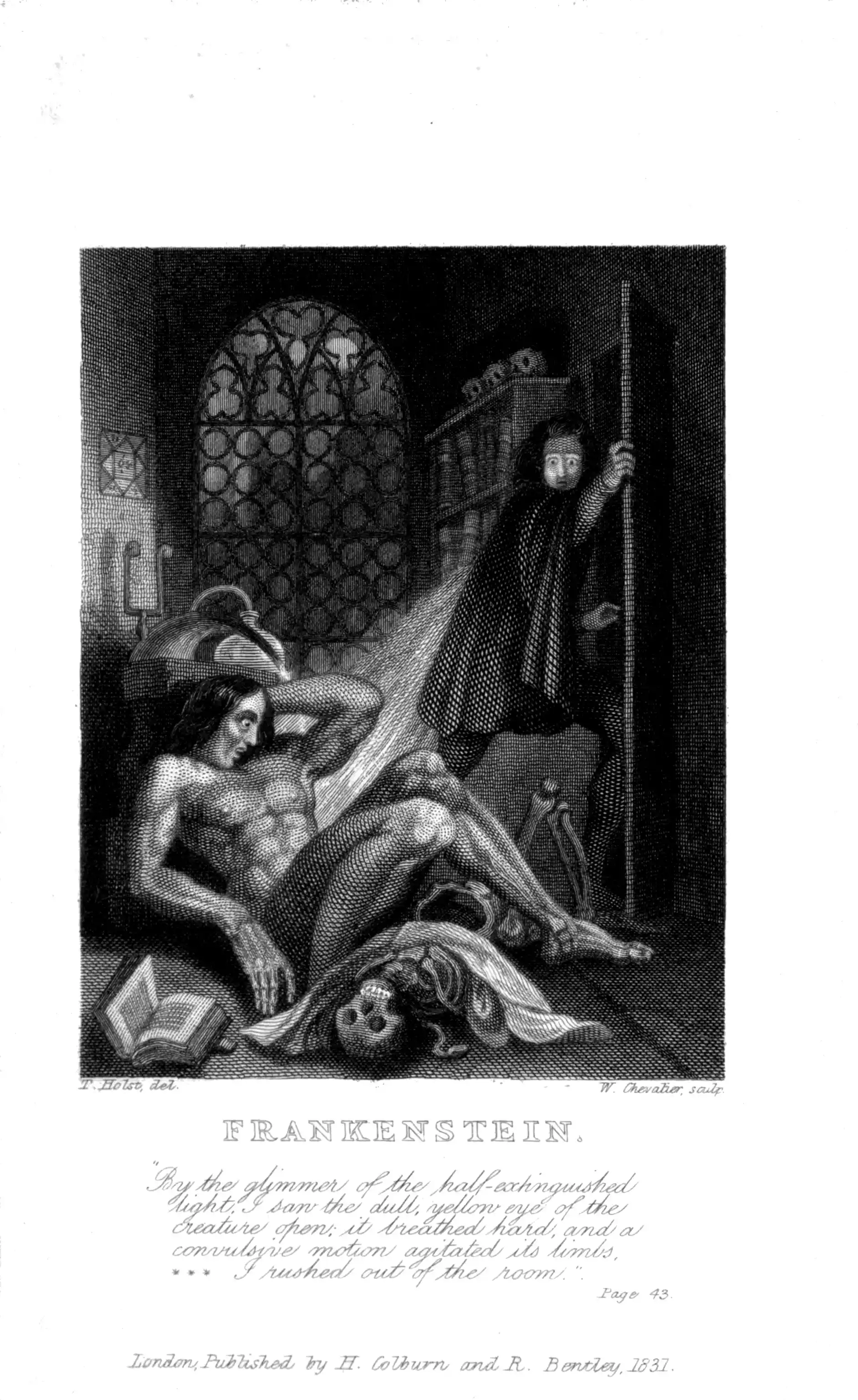 Night waned upon this talk, and even the witching hour had gone by, before we retired to rest. When I placed my head on my pillow, I did not sleep, nor could I be said to think. My imagination, unbidden, possessed and guided me, gifting the successive images that arose in my mind with a vividness far beyond the usual bounds of reverie. I saw—with shut eyes, but acute mental vision,—I saw the pale student of unhallowed arts kneeling beside the thing he had put together. I saw the hideous phantasm of a man stretched out, and then, on the working of some powerful engine, show signs of life, and stir with an uneasy, half vital motion. Frightful must it be; for supremely frightful would be the effect of any human endeavour to mock the stupendous mechanism of the Creator of the world. His success would terrify the artist; he would rush away from his odious handywork, horror-stricken. He would hope that, left to itself, the slight spark of life which he had communicated would fade; that this thing, which had received such imperfect animation, would subside into dead matter; and he might sleep in the belief that the silence of the grave would quench for ever the transient existence of the hideous corpse which he had looked upon as the cradle of life. He sleeps; but he is awakened; he opens his eyes; behold the horrid thing stands at his bedside, opening his curtains, and looking on him with yellow, watery, but speculative eyes.