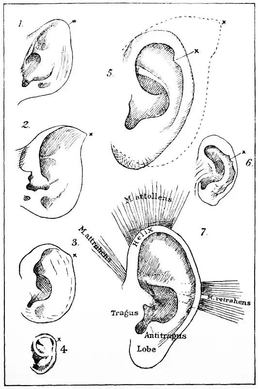 1. Lemur macaco; 2. Macacus rhesus, the Rhesus monkey; 3. Cercopithecus, a macaque; 4. human embryo of six months; 5. man, with Darwin's point well retained: the dotted outline is that of the ear of a baboon; 6. orang-utan (after G. Schwalbe):[8] x the original tip of the ear; 7. human ear with the principal muscles.