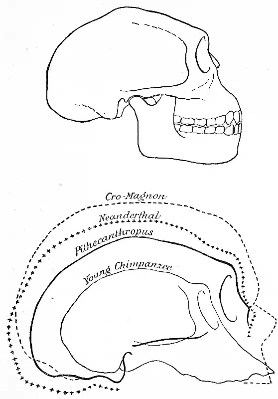 The upper figure represents the outlines of the skull of Pithecanthropus, as restored by Manouvier.[12] The lower figure shows the comparative size and shape of Pithecanthropus, the Neanderthal skull, a specimen of the Cro-Magnon race of neolithic France, and a Young Chimpanzee before the full development of the supraorbital crests.