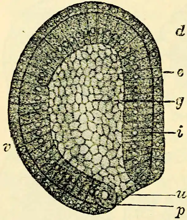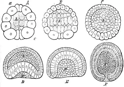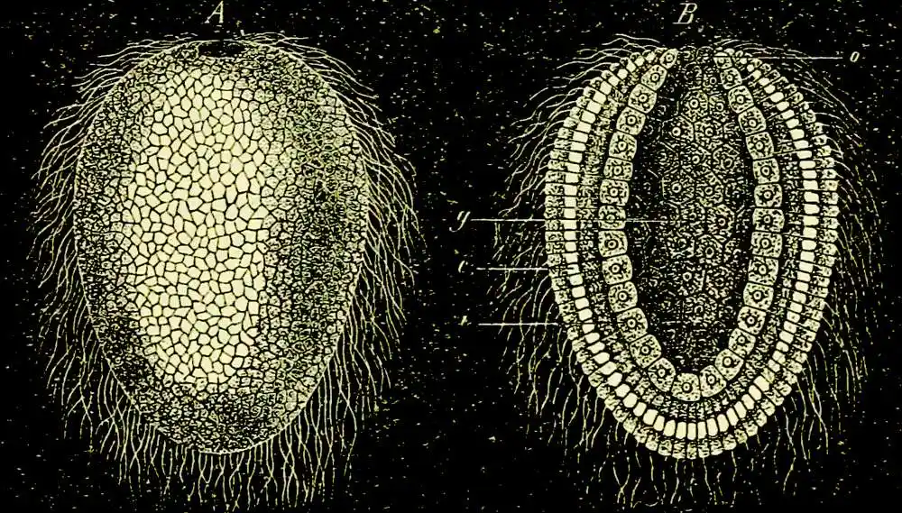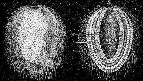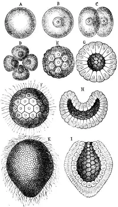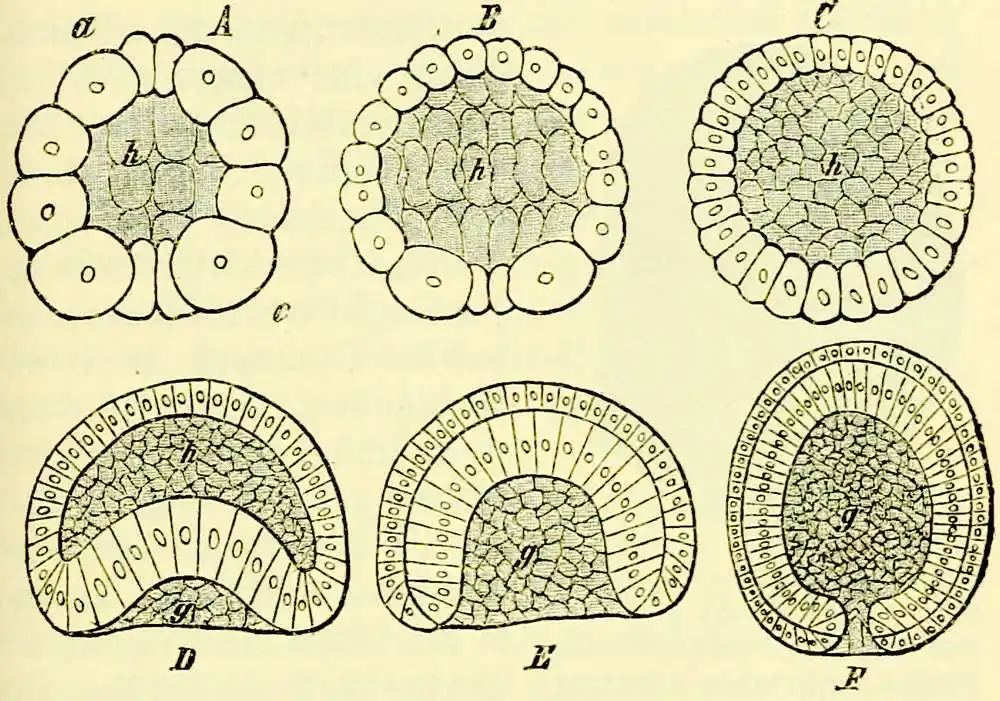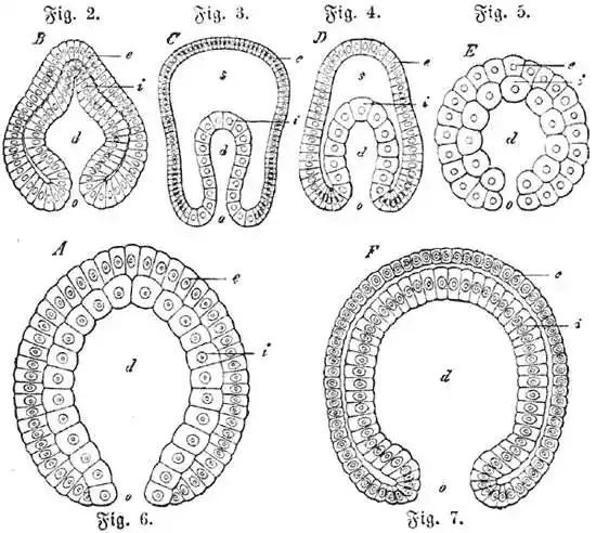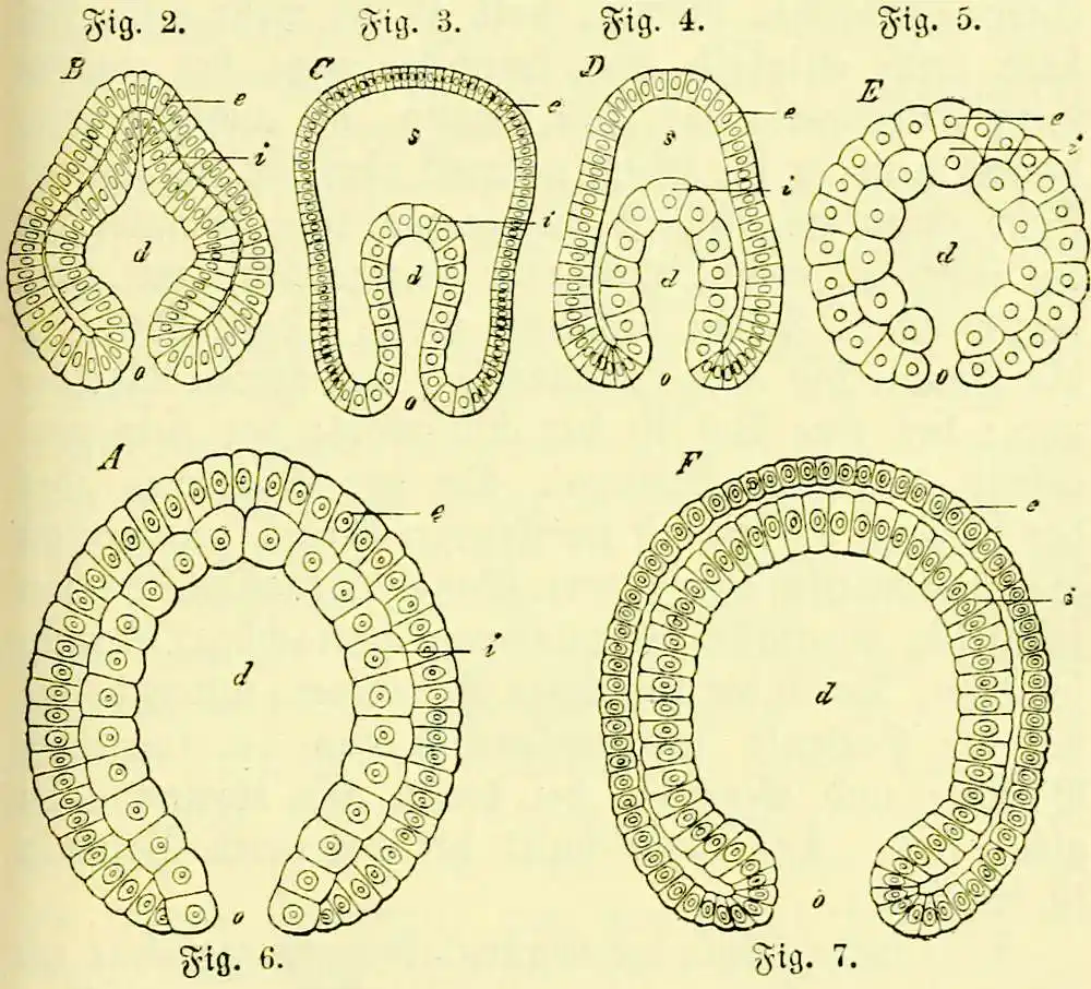 Eine Gastrulation wie die geschilderte vollzieht sich aber nicht bloß bei einer Anzahl von Schwämmen, sondern auch bei vielen Nesseltieren (Polypen, Medusen), bei Würmern, Stachelhäutern und Manteltieren, ja sogar bei dem niedrigsten Wirbeltier, dem Lanzettfisch. Ähnlich — nur die Form der Gastrula ändert sich — spielt sich der Vorgang aber auch in der Keimesgeschichte aller höheren Tiere ab, und eben auf diesem durchgängigen Vorkommen der Gastrula begründete Haeckel seine hypothetische Gasträatheorie. Inzwischen hat man auch wirklich noch lebende Tierformen entdeckt, die dem Bild jener hypothetischen Gasträa annähernd noch völlig entsprechen.