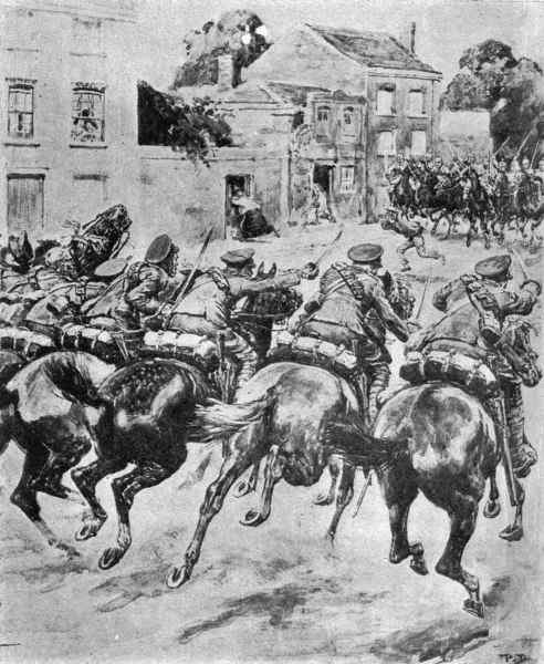All our men—in fact, the whole British Army—are as fit as a fiddle, and the lads are as keen as mustard. There is no holding them back. At Mons we were under General Chetwode, and horses and men positively flew at the Germans, cutting through much heavier mounts and heavier men than ours. The yelling and the dash of the Lancers and Dragoon Guards was a thing never to be forgotten. We lost very heavily at Mons, and it is a marvel how some of our fellows pulled through and positively frightened the enemy. We did some terrible execution, and our wrists164 were feeling the strain of heavy riding before sunset. With our tunics unbuttoned, we had the full use of our right arm for attack and defence.