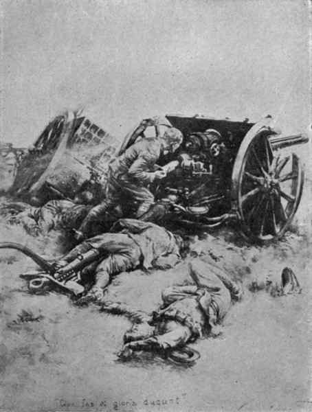 We got a favourable “bracket” at once, so our Major said, and we worked our guns for all we were worth, altering fuses and the ranging of our guns as the Germans came nearer. Shells174 fell fast around us, some ricocheted, and passed overhead without bursting, ploughing the ground up in our rear, but not a few exploded, and made many casualties. Three of my gun detachment fell with shrapnel bullets, but still we kept the guns going, the officers giving a hand.