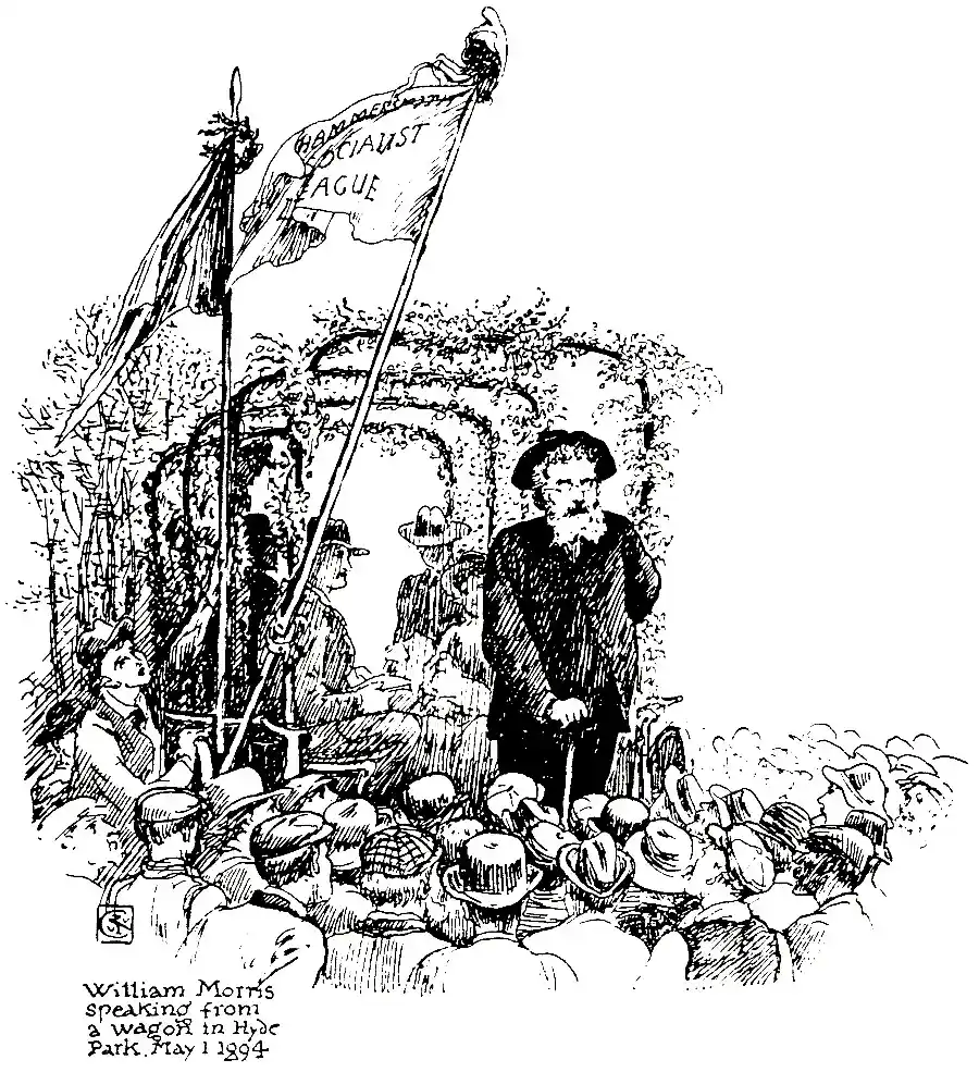 As to the construction and colour of such a new house for reorganized society and regenerated life, William Morris has left us in no doubt as to his own ideas and ideals. It may seem strange that a man who might be said to have been steeped in [pg 14] mediaeval lore,1 and whose delight seemed to be in a beautifully imagined world of romance peopled with heroic figures, should yet be able to turn from that dream world with a clear and penetrating gaze upon the movements of his own time, and to have thrown himself with all the strength of his nature into the seething social and industrial battle of modern England. That the "idle singer of an empty day" should voice the claims and hopes of Labour, stand up for the rights of free speech in Trafalgar Square, and speak from a wagon in Hyde Park, may have surprised those who only knew him upon one side, but to those who fully apprehended the reality, ardour, and sincerity of his nature, such action was but its logical outcome and complement, and assuredly it redounds to the honour of the artist, the scholar, and the poet whose loss we still feel, that he was also a man.