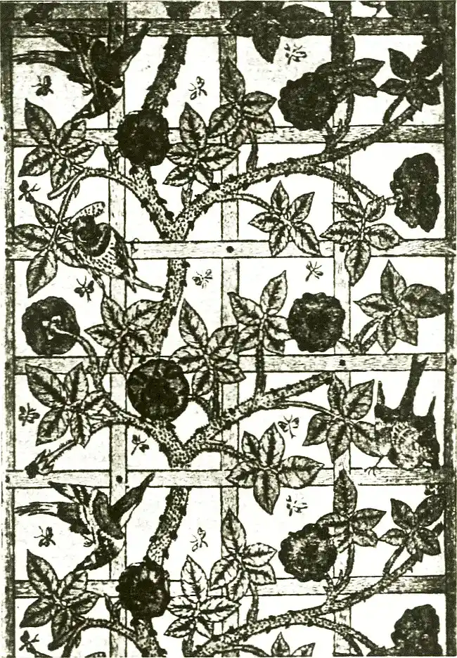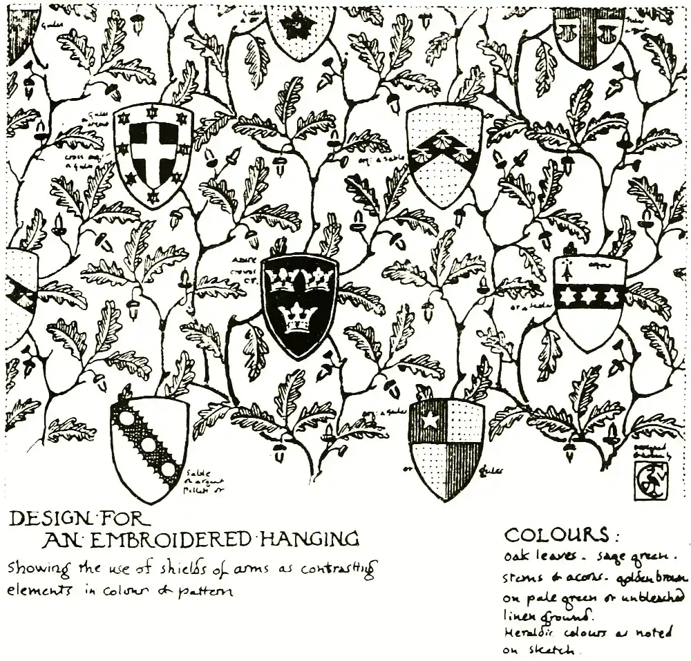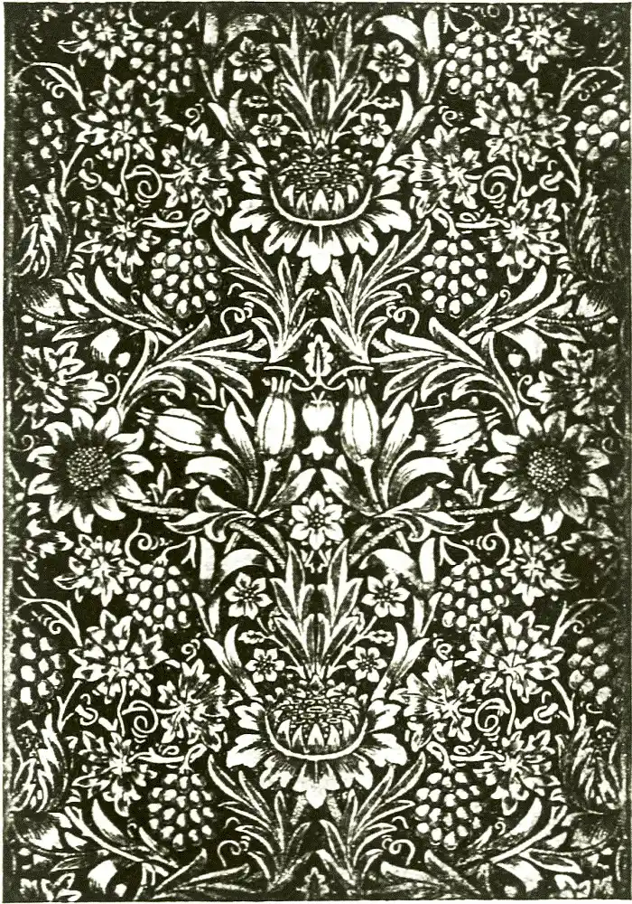 In fact, the designs of William Morris are so associated with and so often form part of the work of others or only appear in some conditioned material form, that little or no idea of his individual work, or of his wide influence, could be gathered from any existing autograph work of his. That he was a facile designer of floral ornament his numerous beautiful wall-papers and textile hangings prove, but he always considered that the finished and final form of a particular design, complete in the material for which it was intended, was the only one to be looked at, and always objected to showing preliminary sketches and working drawings. He was a keen judge and examiner of work, and fastidious, and as he did not mind taking trouble himself he expected it from those who worked for him. His artistic influence was really due to the way he supervised work under his control, carried out by many different craftsmen under his eye, and not so much by his own actual handiwork.