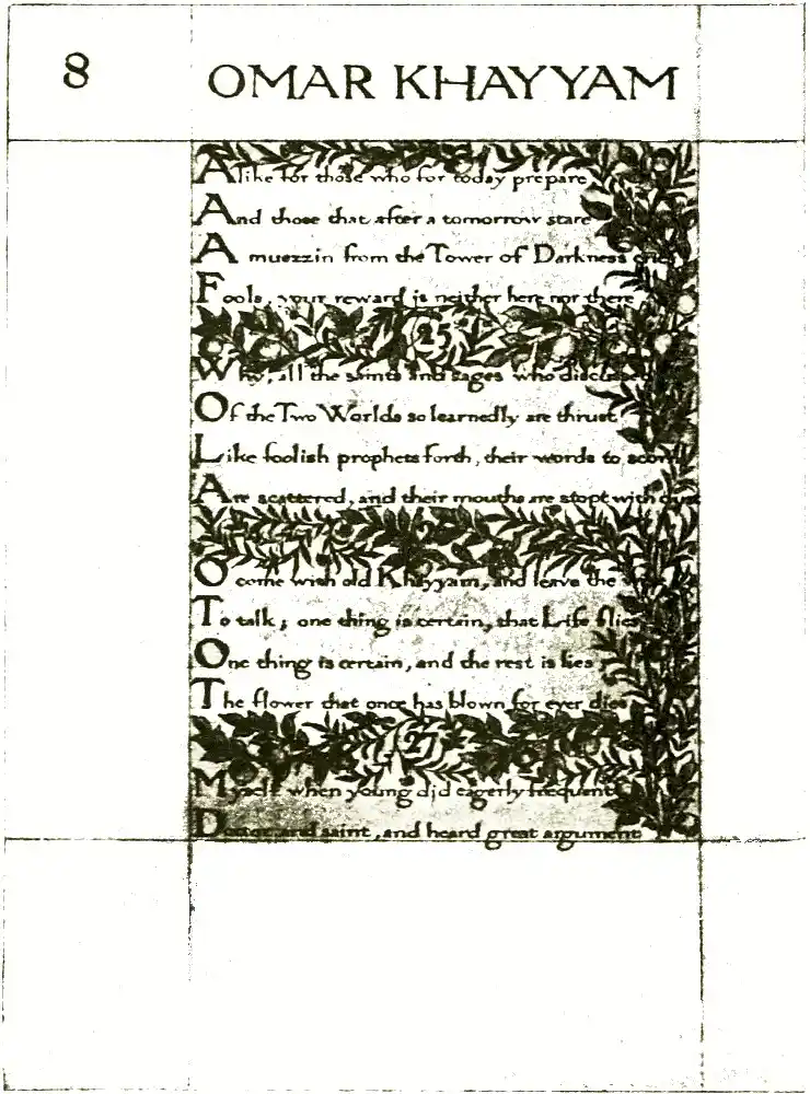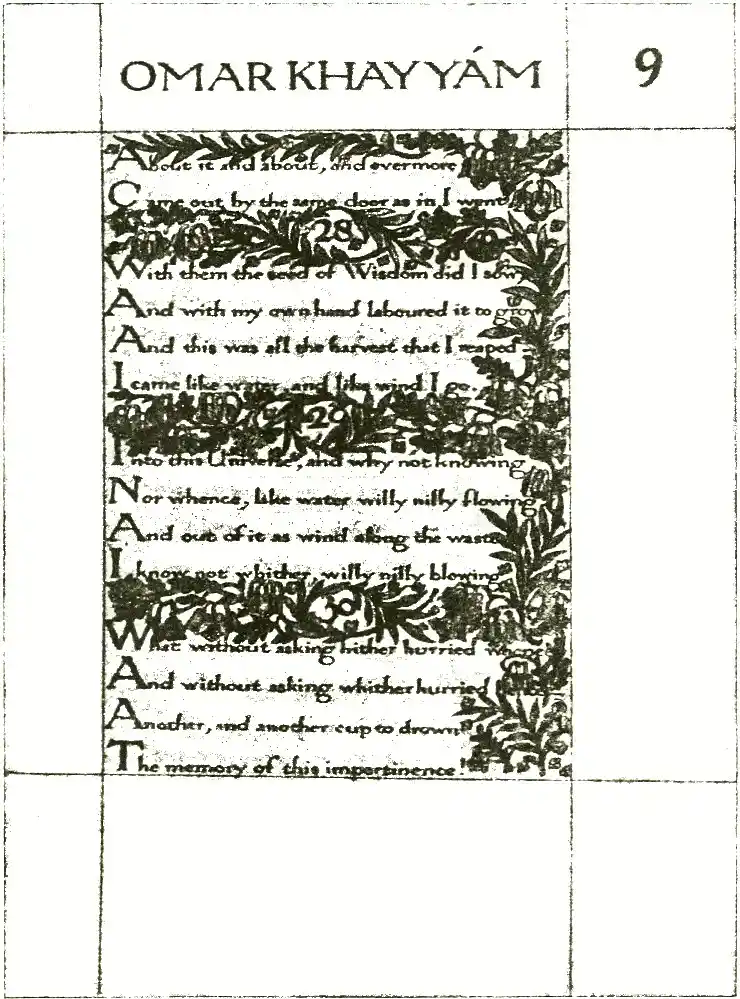 The text in the Omar Khayyám illustrations appears to be missing some end-punctuation, or it is partially hidden by the design. It seems to have been a hand-written copy, by the author (William Morris), of the Fitzgerald translation of Omar Khayyám. As it is hand-written, it has not been amended to the Fitzgerald translation.