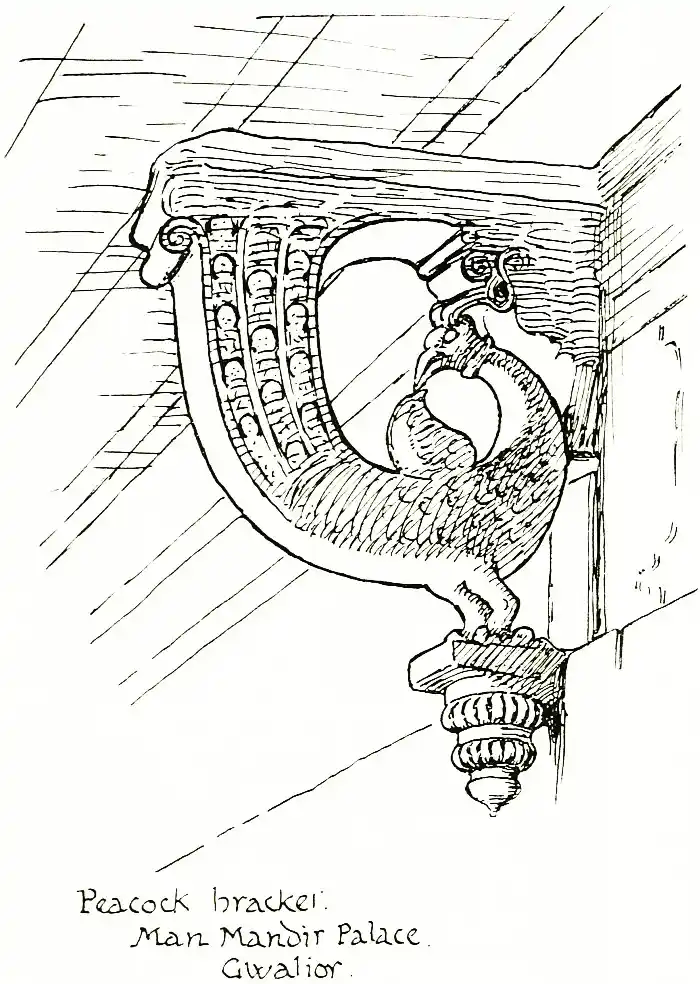 Then there was a "one man show" in a gallery in Pall Mall (No. 48), opposite Marlborough House, in which "Old Battersea Bridge, Nocturne in blue and gold" loomed large, I remember, and the town was surprised by something fresh in the decorative arrangement of the exhibition, yellow and gray predominating, if I remember rightly, relieved with blue pots and palms. This is mentioned in the Life at p. 179. Then came the famous "Peacock Room" in Prince's Gate, which chiefly sustains Whistler's repute as what one may call a [pg 267-268] practical decorator. It is to be deplored that the room itself was not more beautiful in structure and arrangement, cut up as it was with fidgetty details, with pendants from the ceiling and shelves for china. Still, of course, the business of a decorator is to adapt his scheme to the place decorated, and certainly this was done quite thoroughly by Whistler, and the blue and gold scheme was worked out very consistently and ingeniously upon the theme of the peacock.