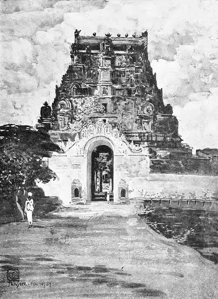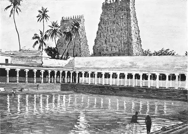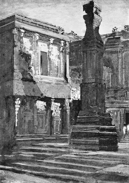 After this we reached the Palace of Tiramala,285 which stood at the head of a large village—an imposing structure in stucco, mostly yellow washed. The enormous columns of the court looked out of proportion to the arches they supported, which were of a rather debased Mogul type, heavy with very elaborate grotesque ornamentation in stucco in the spandrils and on the ceilings, many of which had as a central device a large lotus flower formally treated as a rosette, and in some instances elaborately painted. The effect of the whole building was rather weird, and suggested a rather queer architectural nightmare, in which massive Norman cathedral piers had swallowed Roman Doric ones, or vice versa, and a Hindu modeller had broken up some Mogul arches, and fastened them together again with grotesque elephants and dragons’ teeth.