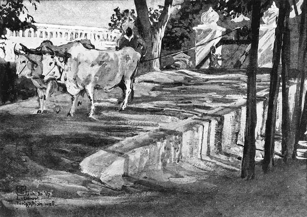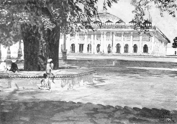 Another afternoon we drove out through the city and some three miles beyond to see the “Teppa Tank”—a large sheet of water, enclosed by a low wall painted in red and white stripes, with steps to the water and carved bulls decorating the balustrades. On an island in the centre of the tank rose the pagoda of a temple, in stucco, and four small pagodas at the four corners of the garden-island—a mass of foliage amid which the pagodas shone, ivory-white in the sunshine.